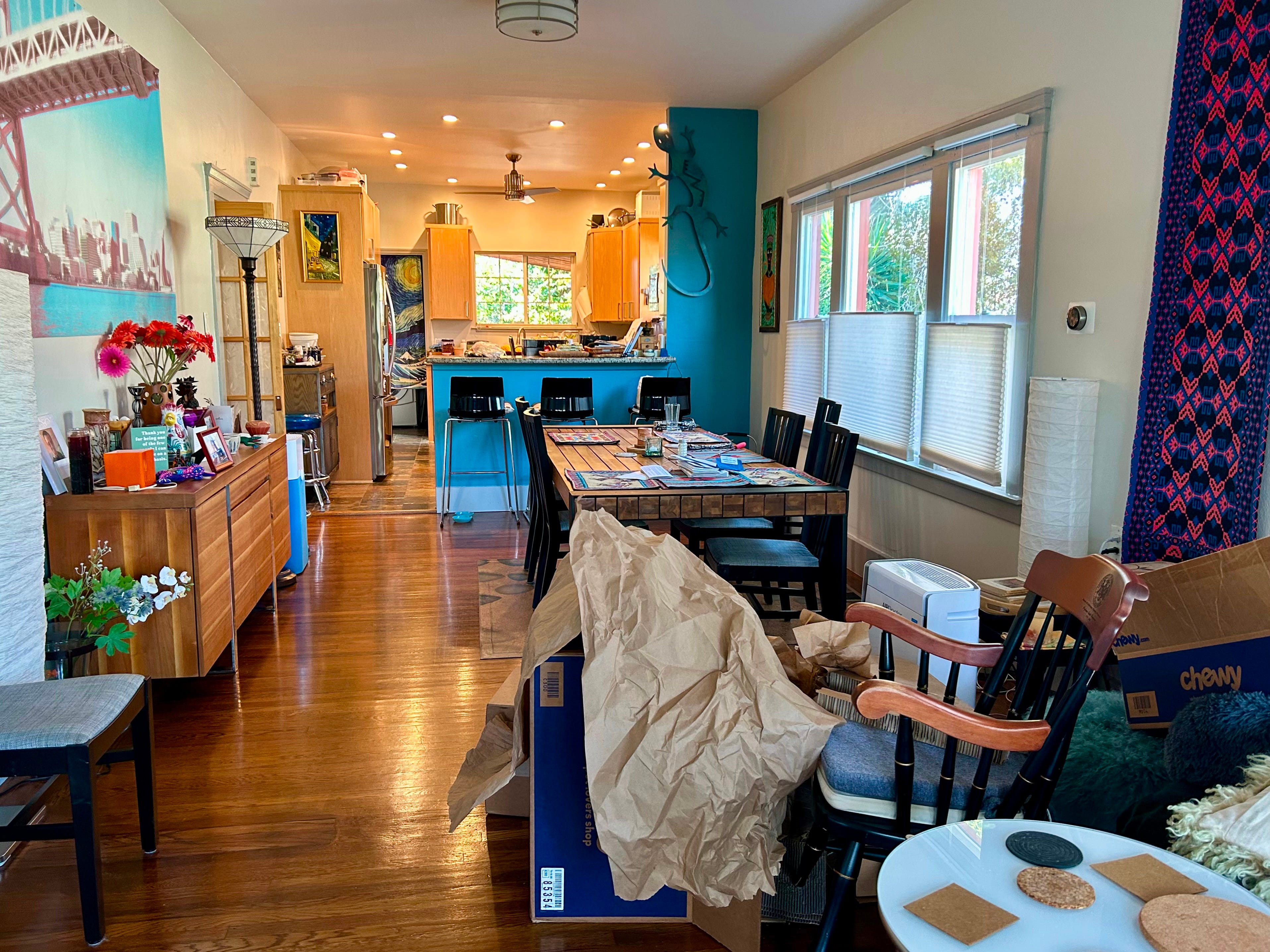 But our guests can dress however they want. They can put their coats down wherever. They can go to the kitchen to get themselves a glass of water. They can take their shoes off and stretch out on the couch. We might provide a meal or we might have a potluck — but even if I cook several courses, the atmosphere stays casual, dammit.
